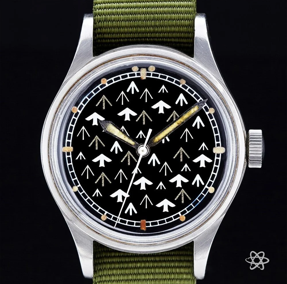In 2015 acclaimed watch photographer Atom Moore created his first series of Mashup Watch Art. While working for AnalogShift in NYC he photographed many different variations of the “dirty dozen” British military watches. The use of the broad arrow on the dial was present in all variations of these watches, made by 12 different manufacturers, to indicate this was government property and for non-civilian use. A simple three lines were used to create the broad arrows but the variation between each one was the detail that inspired Atom. The title for the original art piece “Fat Arrow” is based on the more robust arrow coined by collectors of these World War II-era timekeepers. Atom has created dozens of Mashup watch art pieces since 2015 and has had several exhibitions of his signature metal prints. Most recently at the NAWCC The National Association of Watch and Clock Collectors Museum in Columbia, PA, and the Watches of Switzerland Boutique in SoHo NYC.